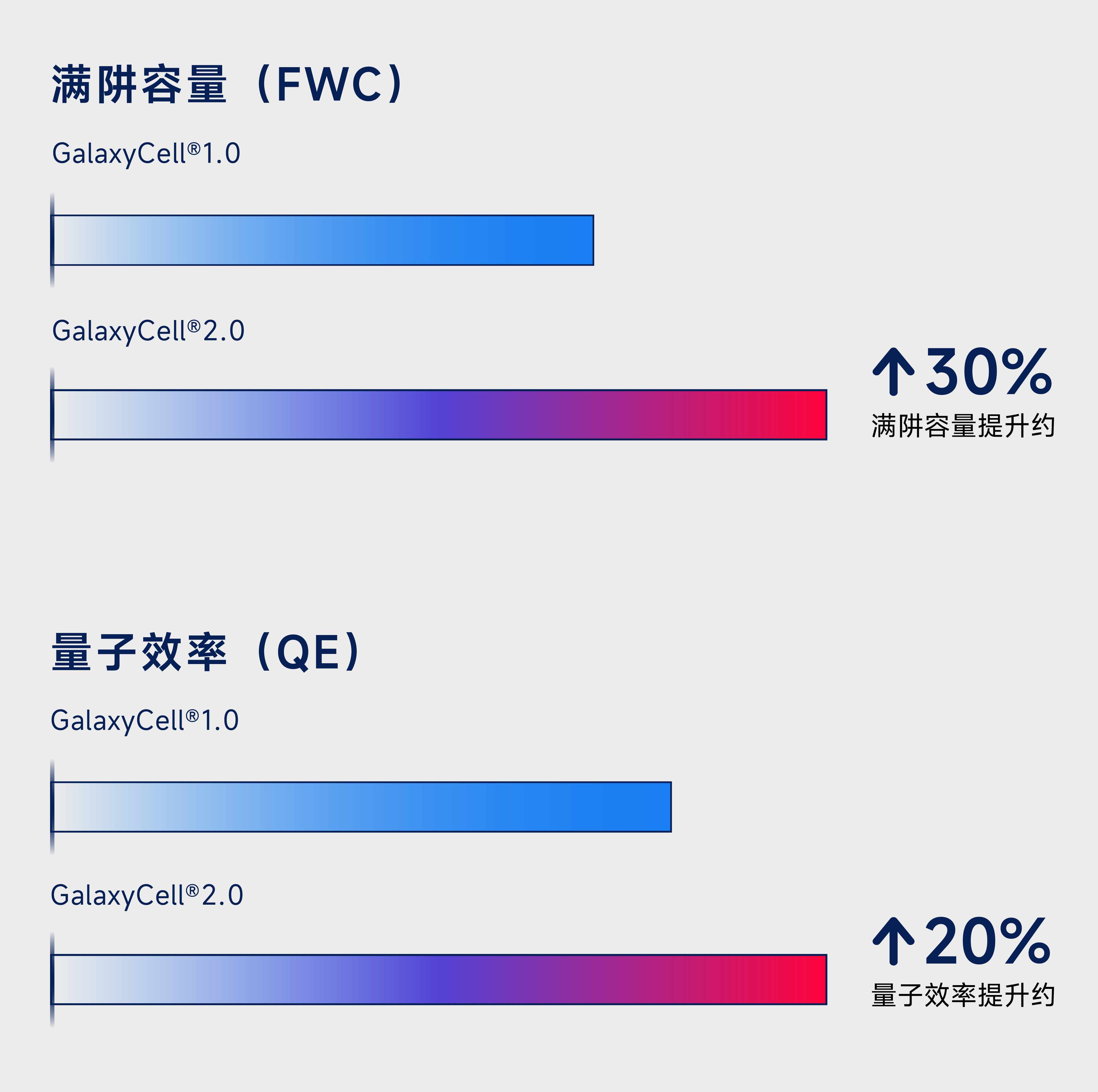 GalaxyCell®2.0工艺在1.0工艺的基础上进行了全面升级,具有显著的性能提升,同像素规格产品表现更加出色。