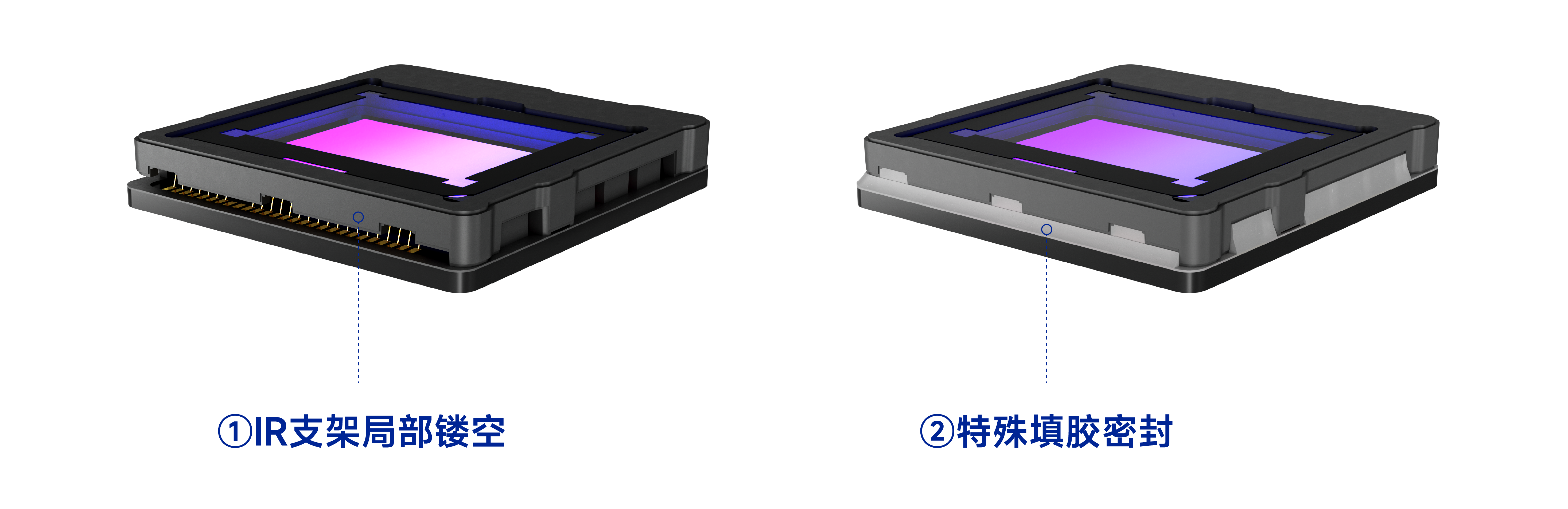 而TCOM在实现小型化设计的同时,兼具了性能和成本上的优势。首先,改善支架设计。在连接CIS与FPC电路板的金线两侧,IR支架局部镂空,宽度缩短约10%。然后采用独特的填胶工艺和设备,在元器件放置两侧、IR支架与元器件之间,按一定角度完成填胶密封。